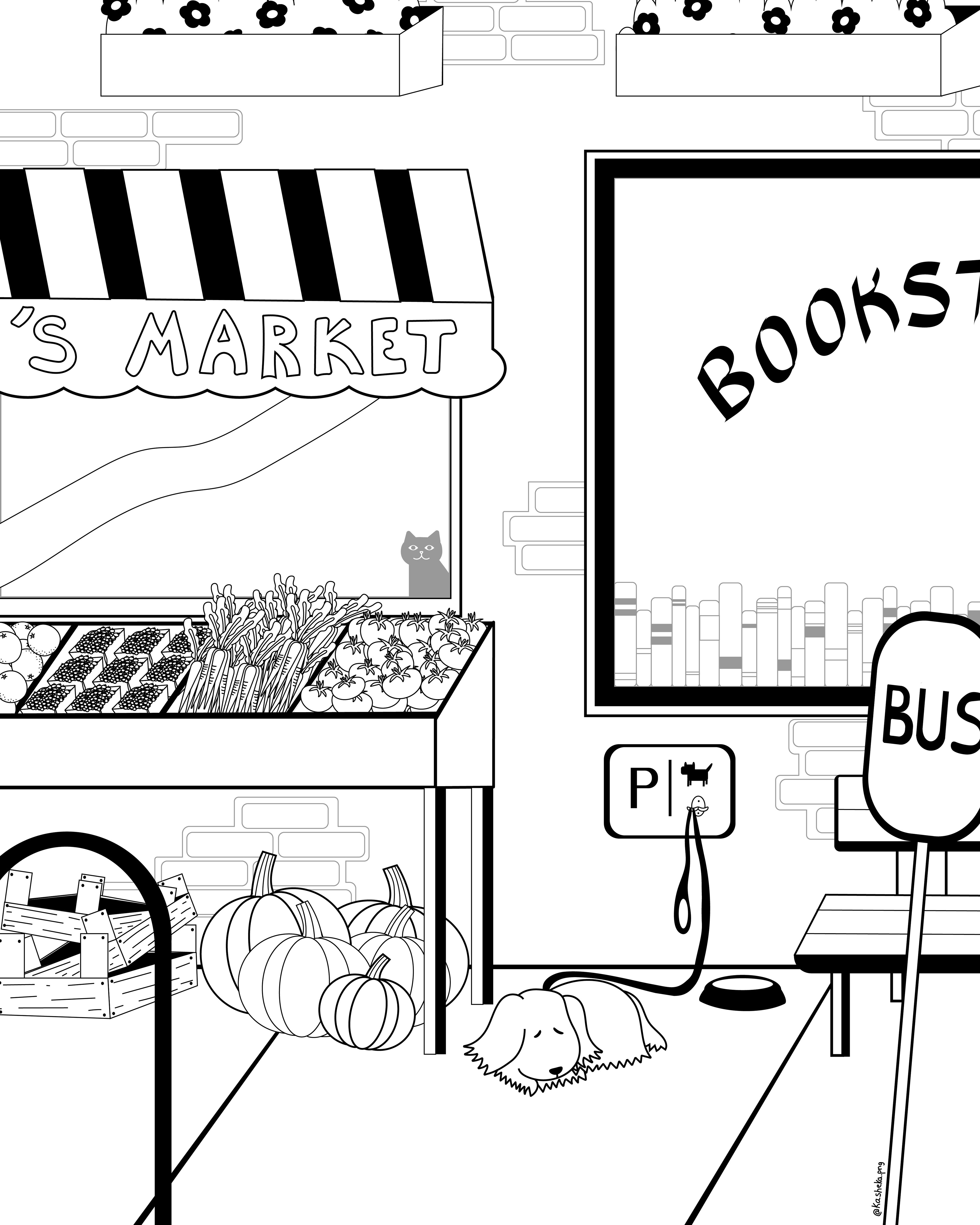 A series of playful illustrations highlighting urban planning themes and advocating for walkable communities, bike-friendly streets, and accessible alternative transportation options.